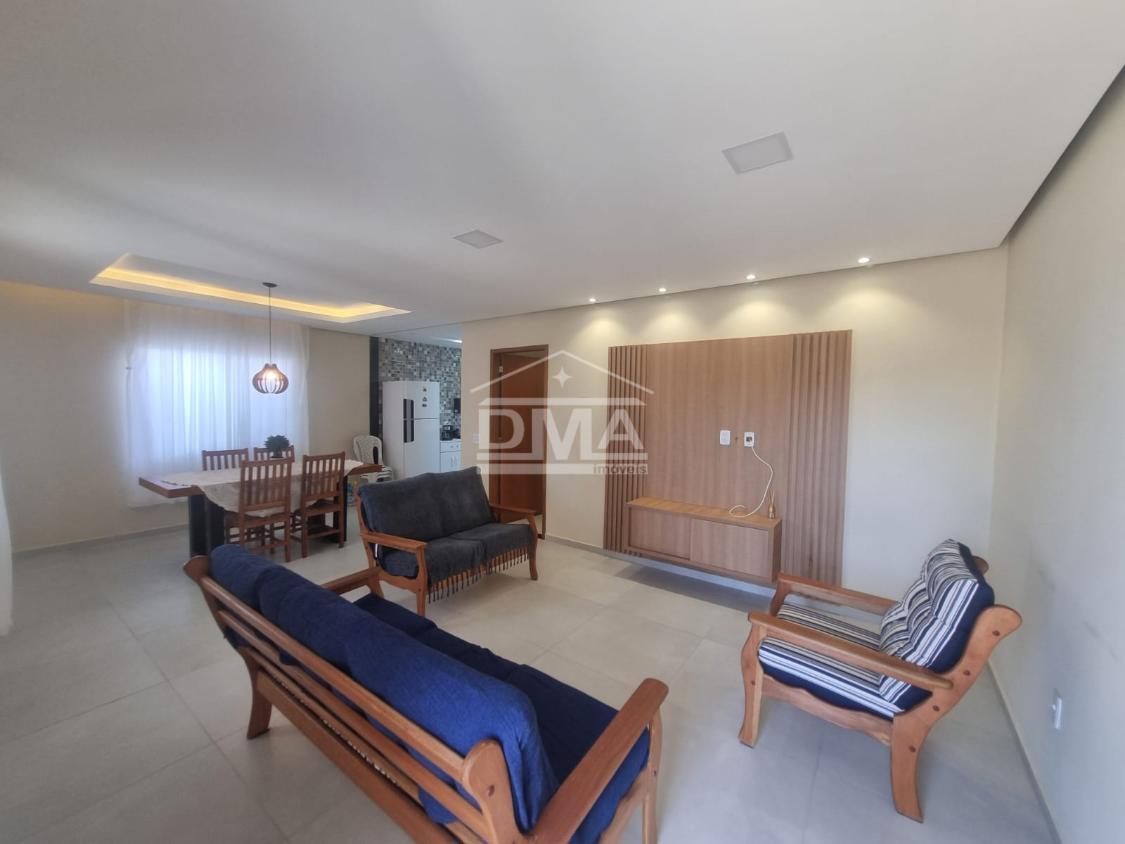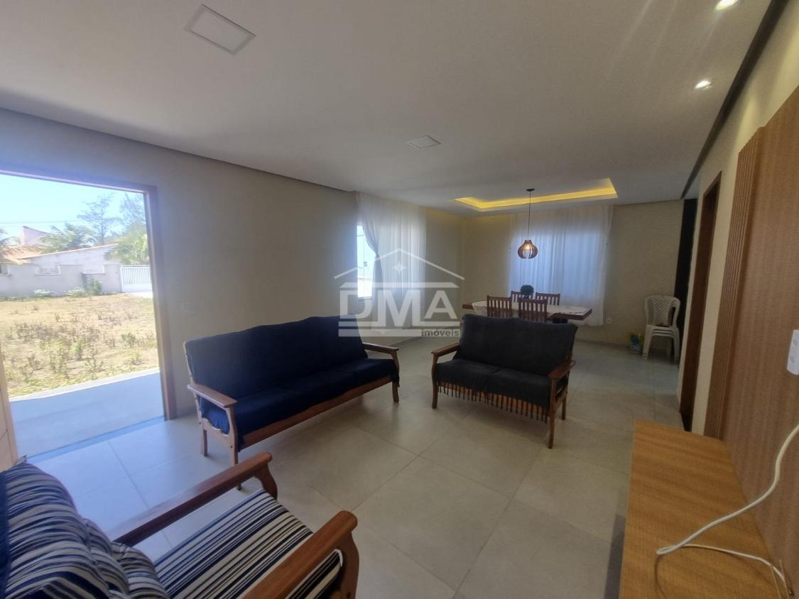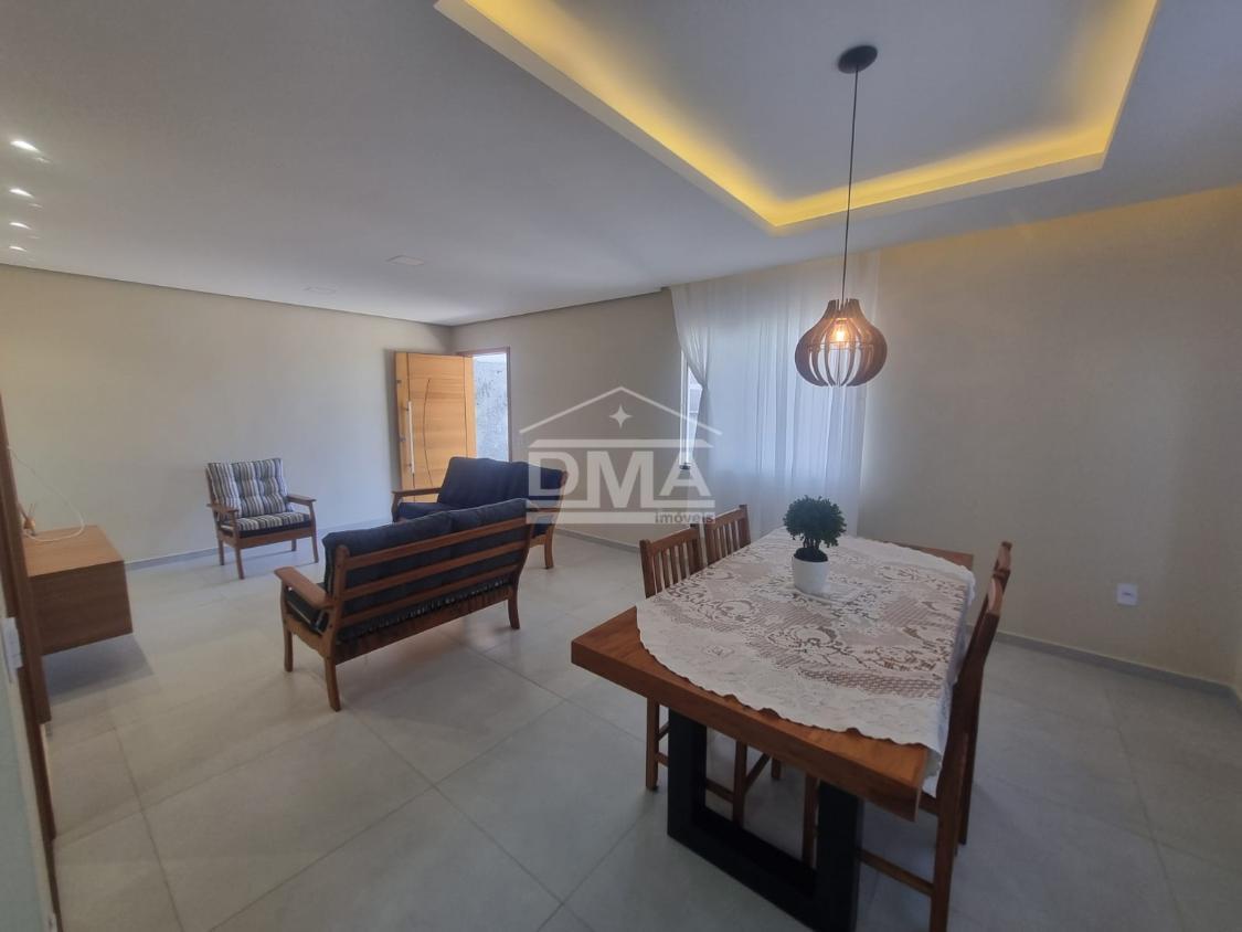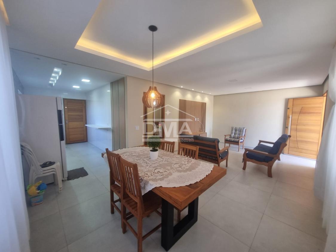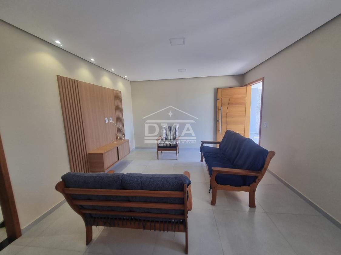 Casa linear, recém construida, possuindo uma ampla sala de estar com sofás e painel de TV, sala de jantar com mesa com 6 cadeiras, ambientes integrados, cozinha com armarios planejados, fogão, geladeira, suggar, corredor, banheiro social com ármario planejado, tres quartos sendo uma suíte espaçosa, trazendo conforto.