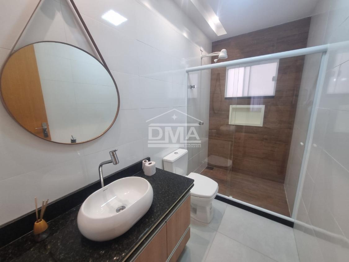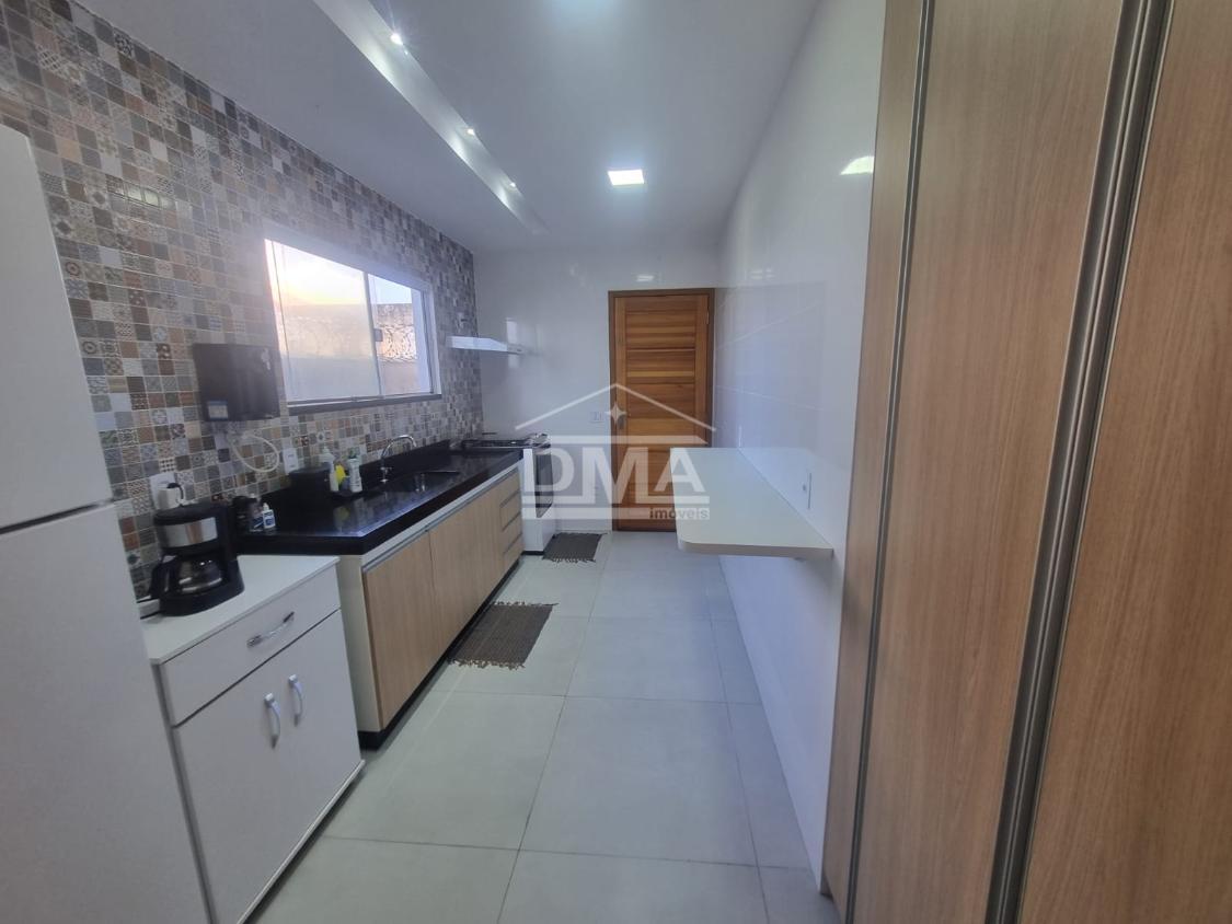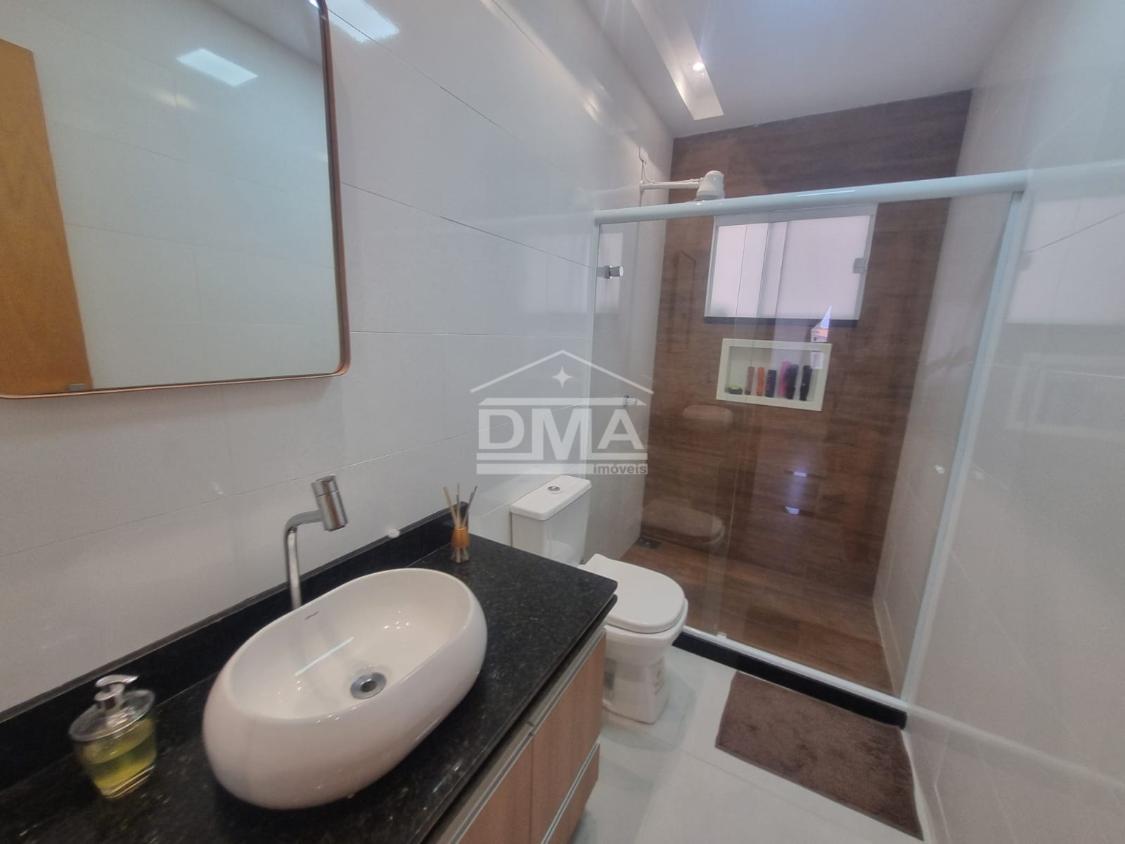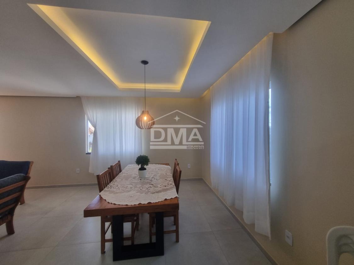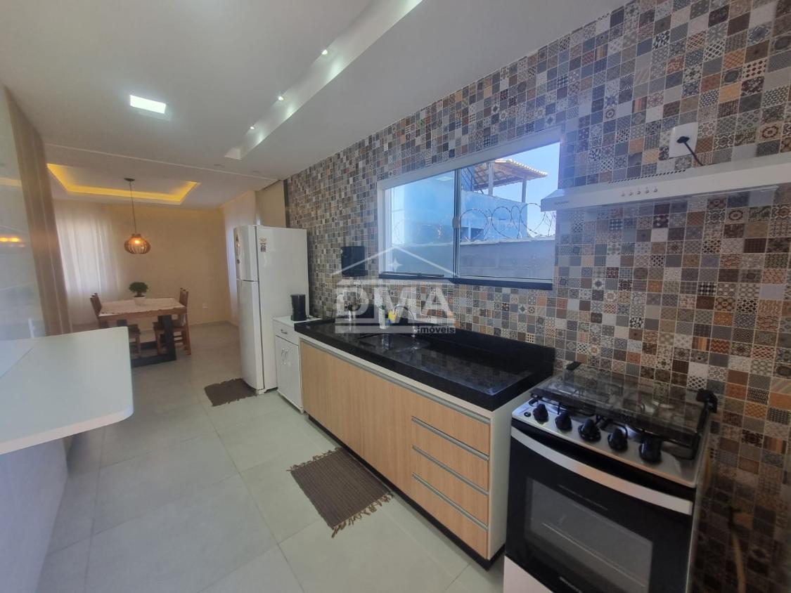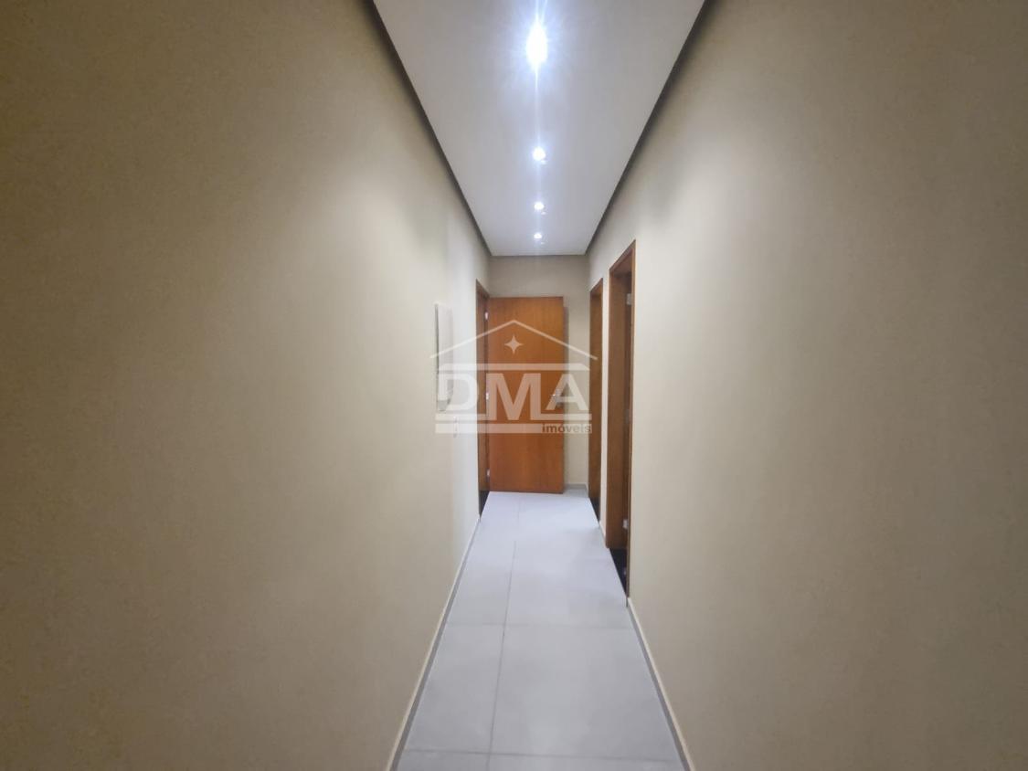 Casa linear, recém construida, possuindo uma ampla sala de estar com sofás e painel de TV, sala de jantar com mesa com 6 cadeiras, ambientes integrados, cozinha com armarios planejados, fogão, geladeira, suggar, corredor, banheiro social com ármario planejado, tres quartos sendo uma suíte espaçosa, trazendo conforto.