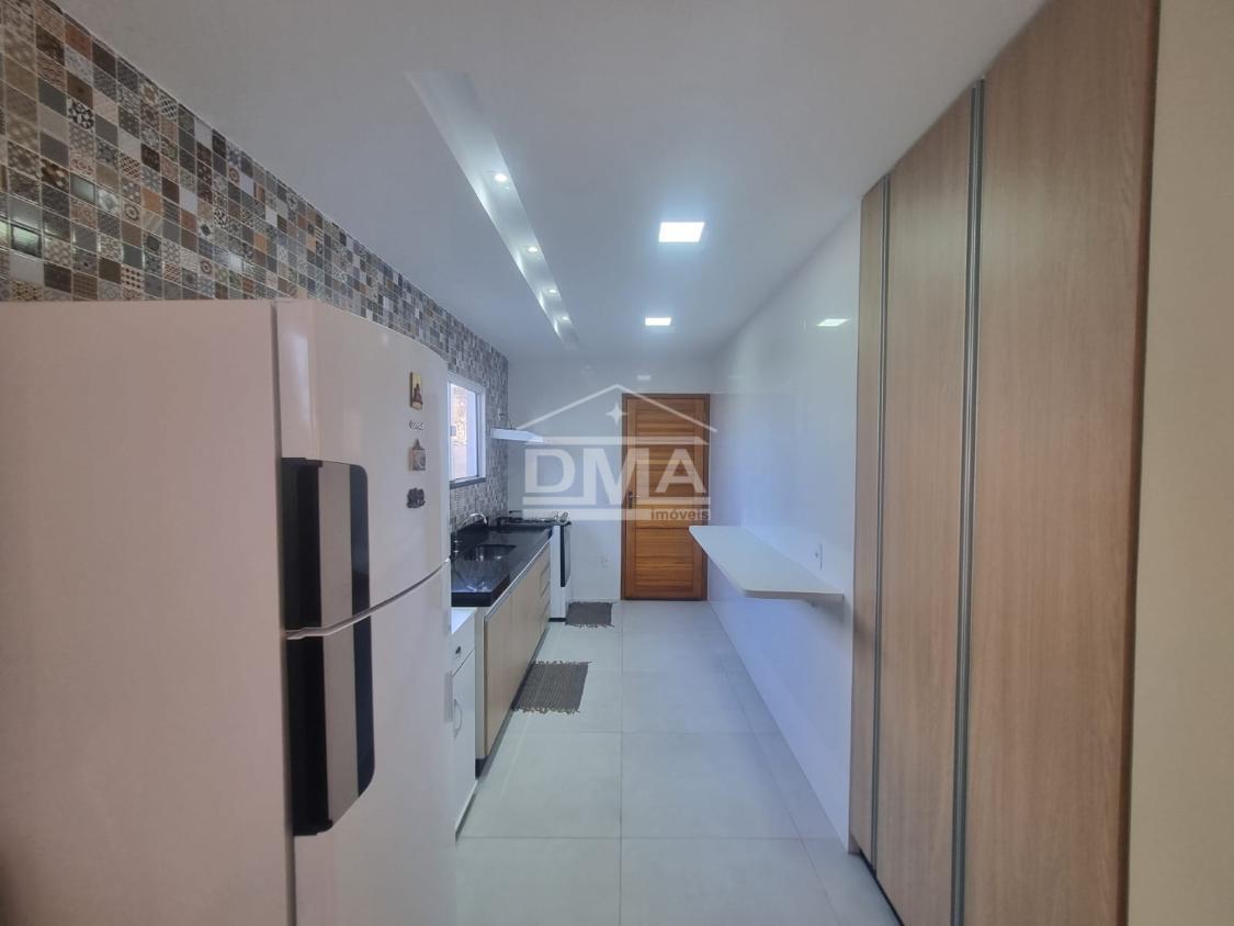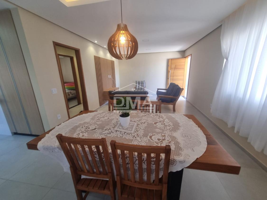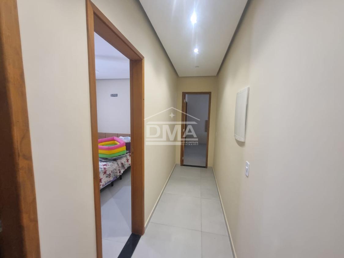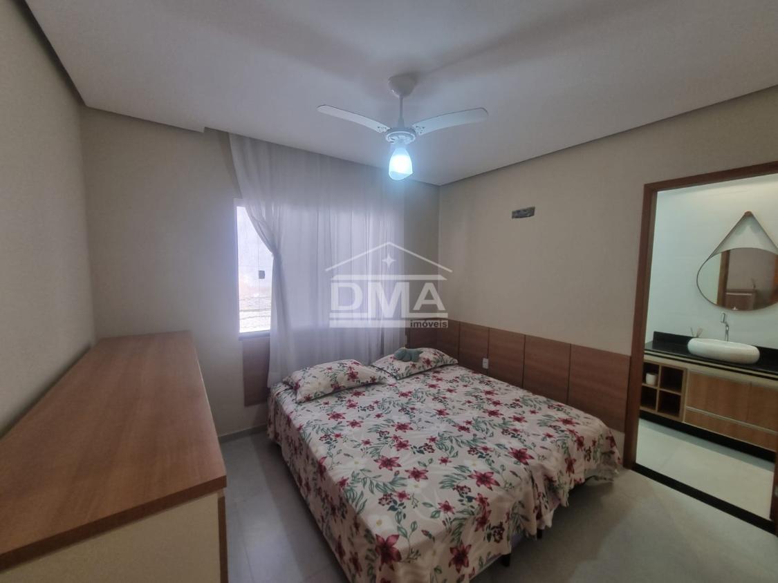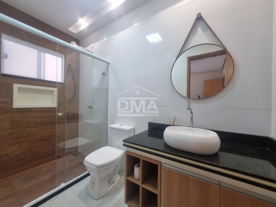 Casa linear, recém construida, possuindo uma ampla sala de estar com sofás e painel de TV, sala de jantar com mesa com 6 cadeiras, ambientes integrados, cozinha com armarios planejados, fogão, geladeira, suggar, corredor, banheiro social com ármario planejado, tres quartos sendo uma suíte espaçosa, trazendo conforto.