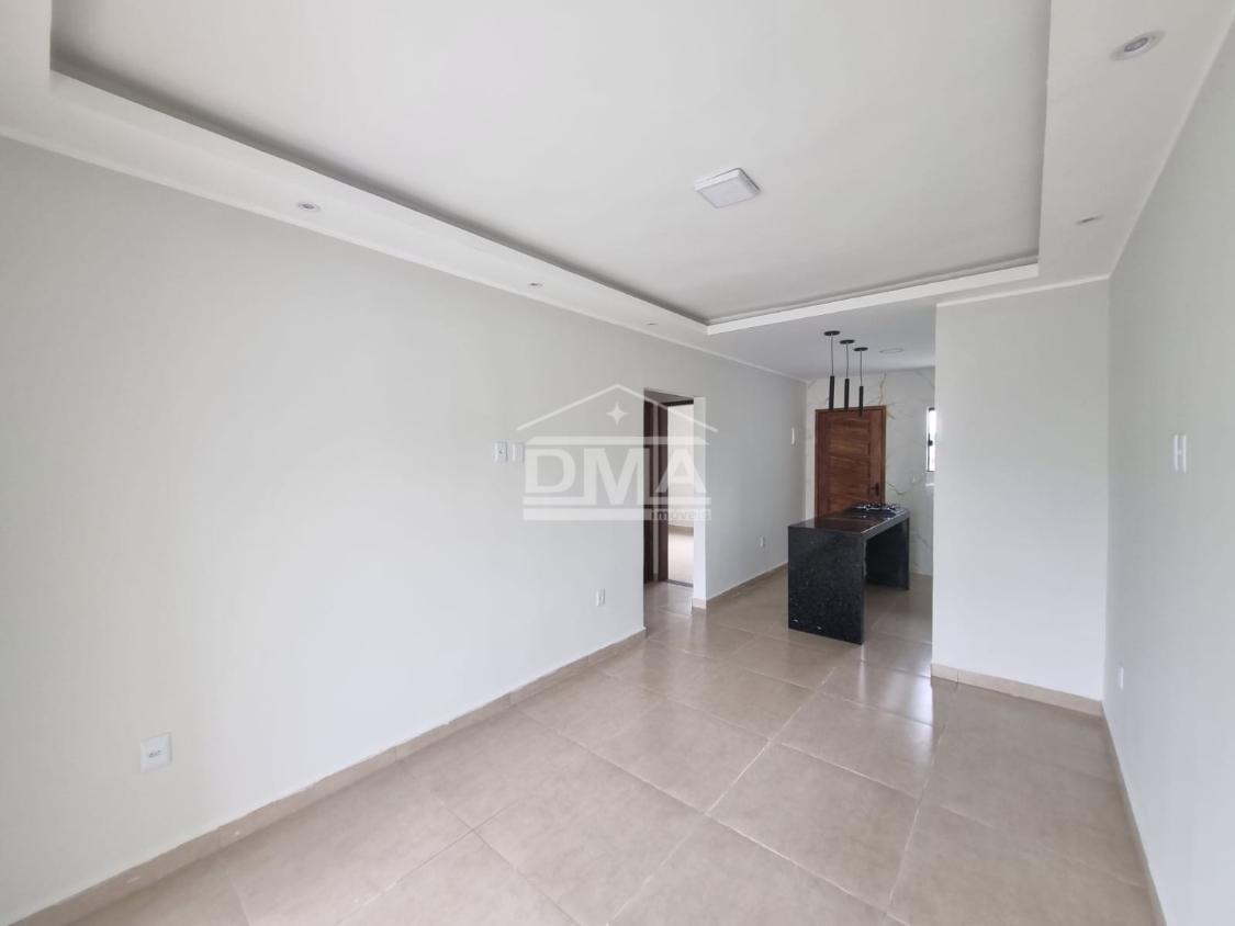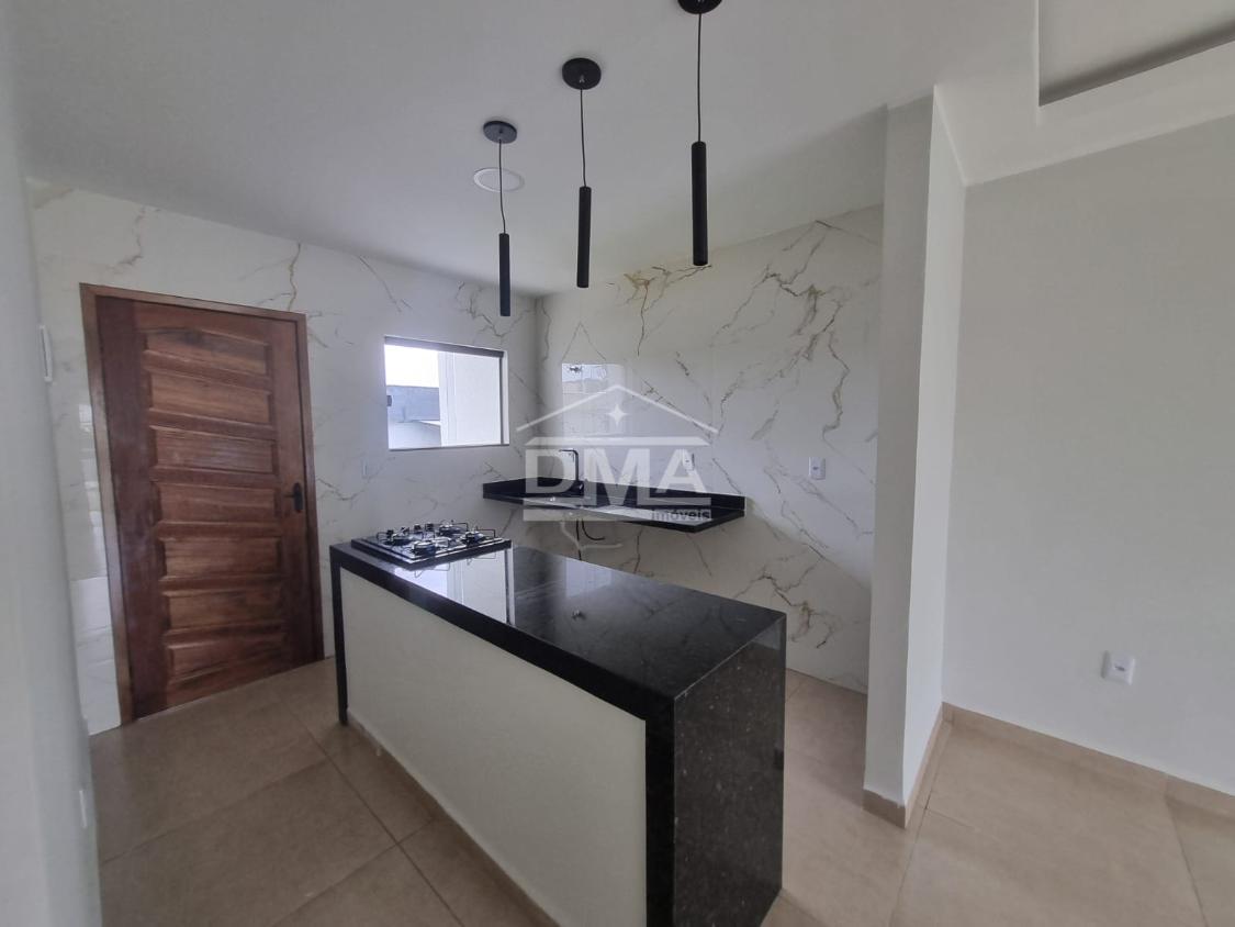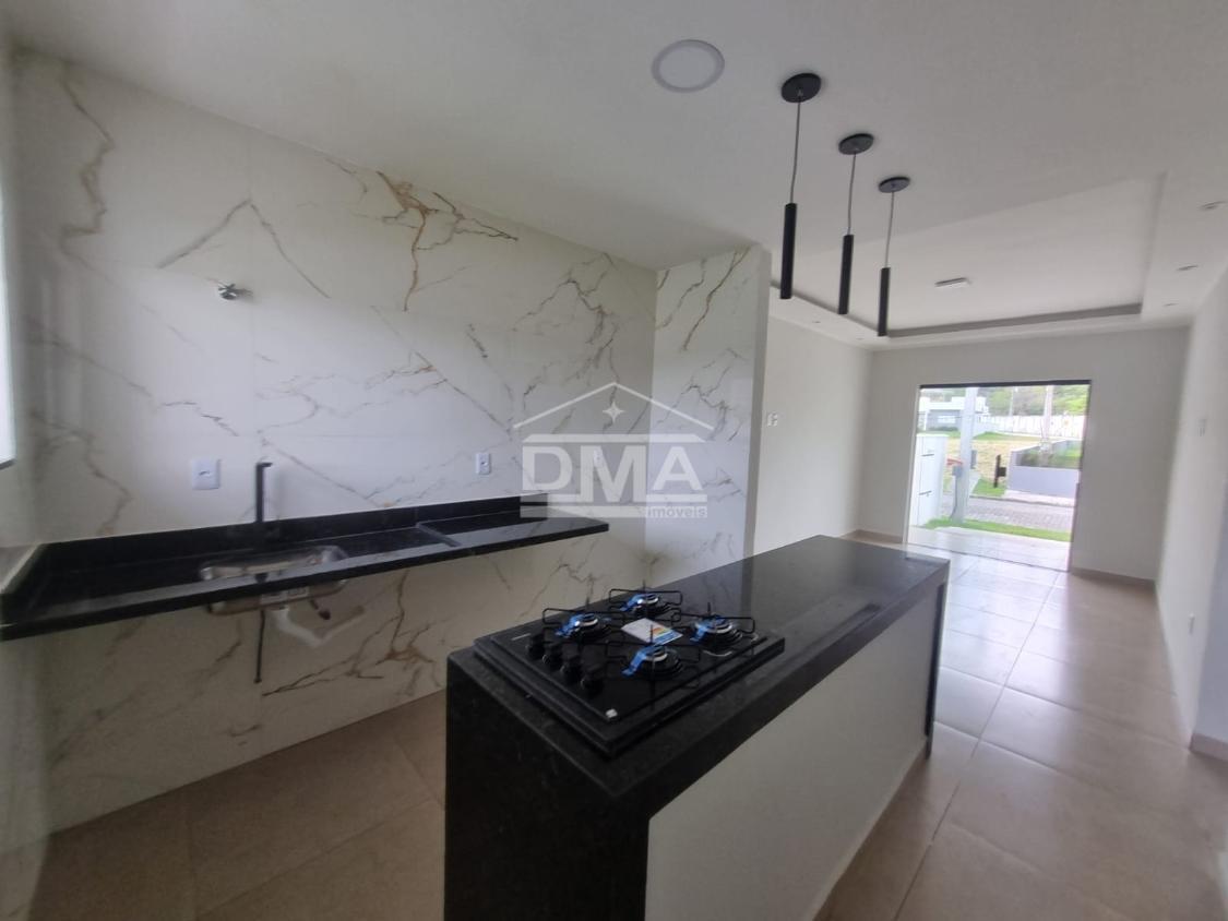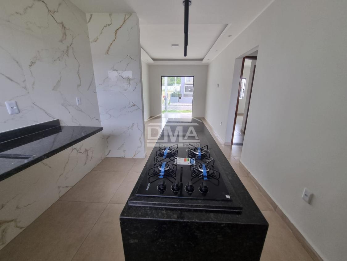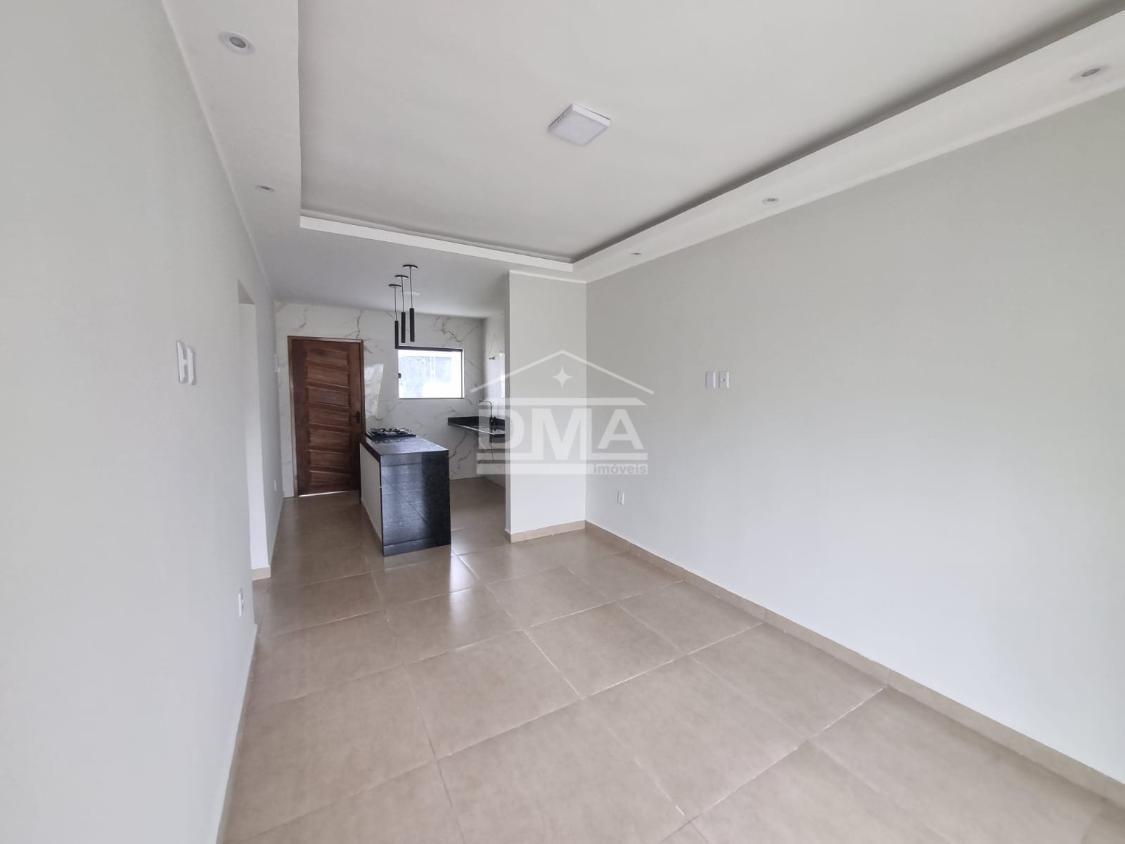 Casa linar, possuindo sala com sanca em gesso, cozinha em conceito aberto com ilha e fogão cooktop 4 bocas, dois quartos sendo uma suíte, banehrio social, área de serviço, vaga para 2 carros, quintal gramado.