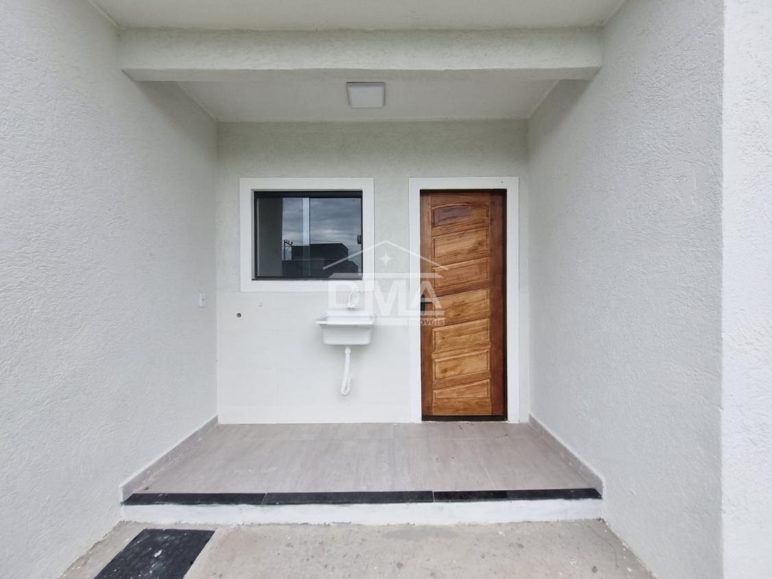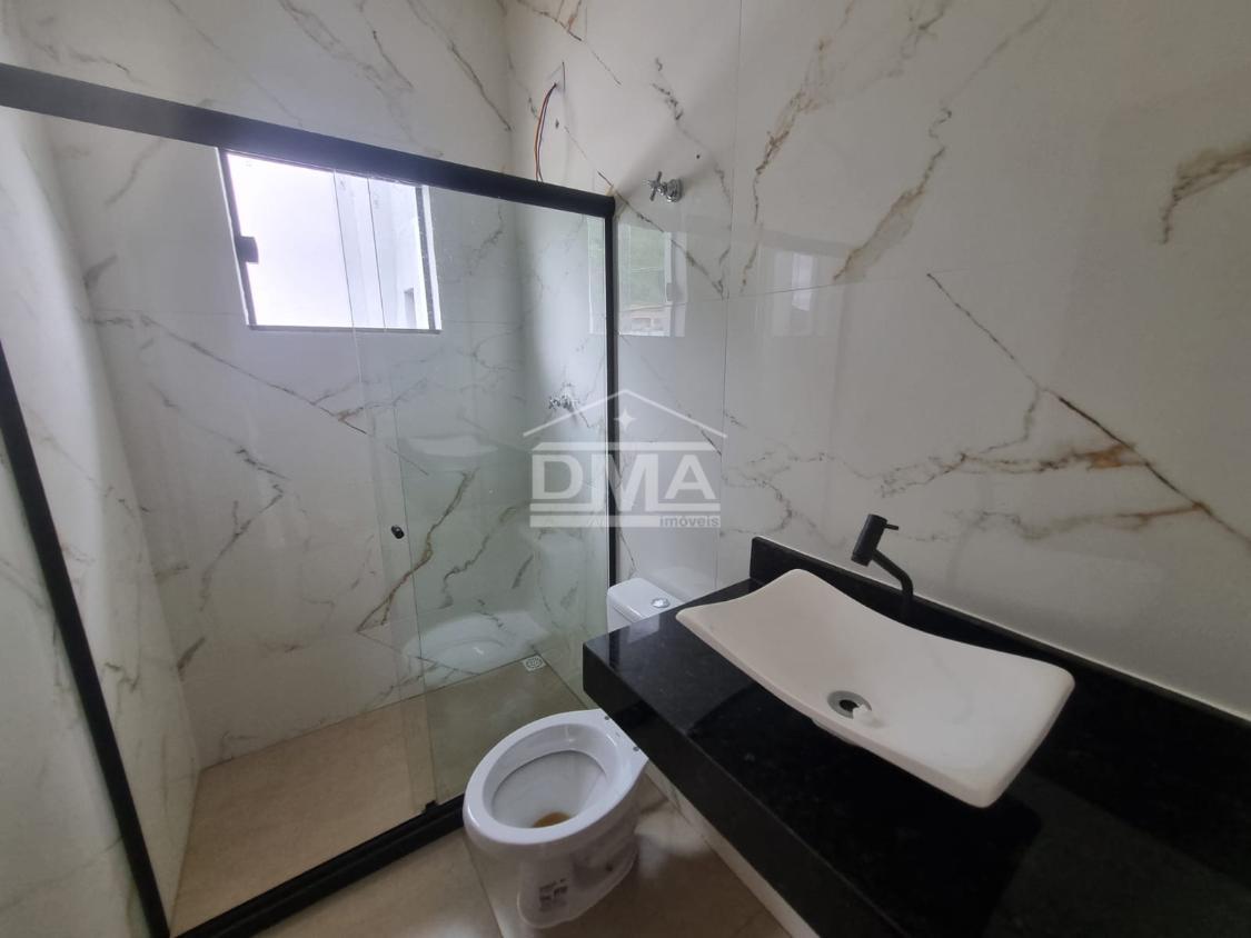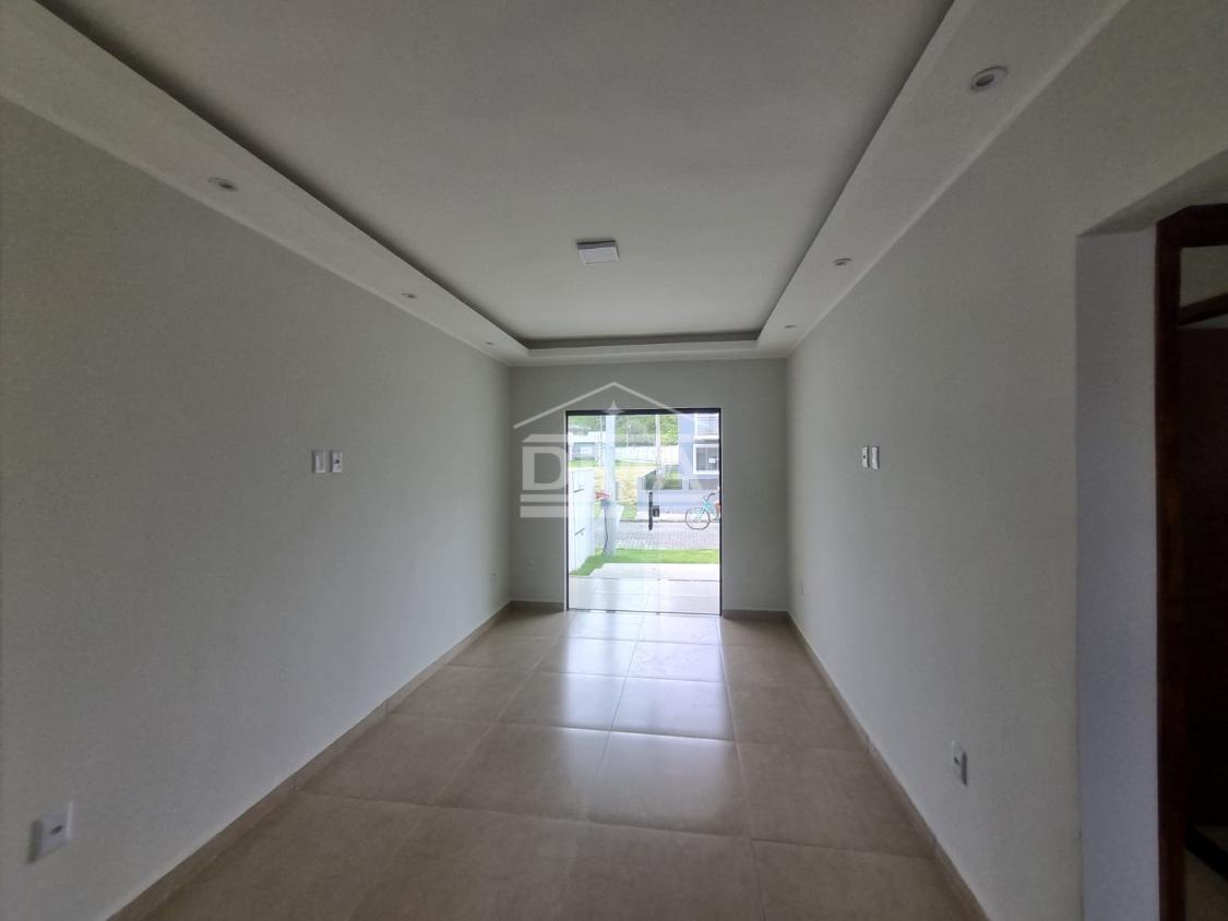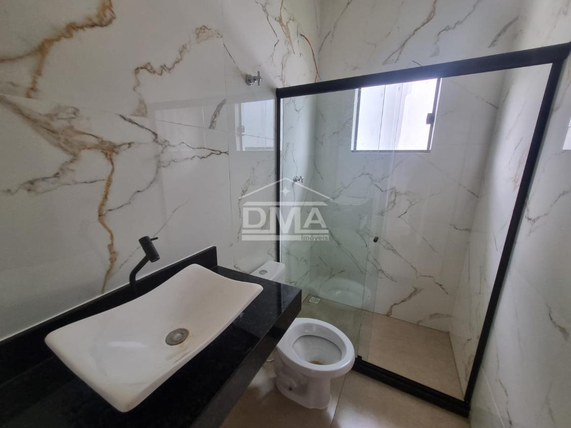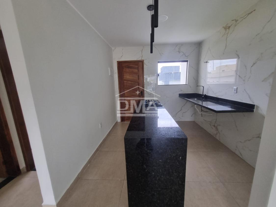 Casa linar, possuindo sala com sanca em gesso, cozinha em conceito aberto com ilha e fogão cooktop 4 bocas, dois quartos sendo uma suíte, banehrio social, área de serviço, vaga para 2 carros, quintal gramado.
