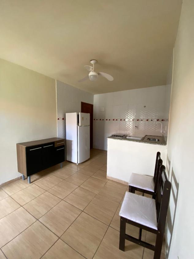 Semi-mobiliado: Sala com cozinha americana : mesa de jantar, geladeira, fogão, armário.